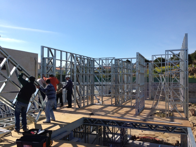 O processo de construção da casa em LSF começa com a descarga dos componentes do LSF no local da obra, onde foi previamente preparada uma laje de Betão. O passo seguinte é a montagem das paredes de aço que formam a estrutura da casa, seguindo as especificações do projeto. O sistema LSF permite uma montagem rápida e eficiente da casa, com o mínimo de resíduos e impacto ambiental.